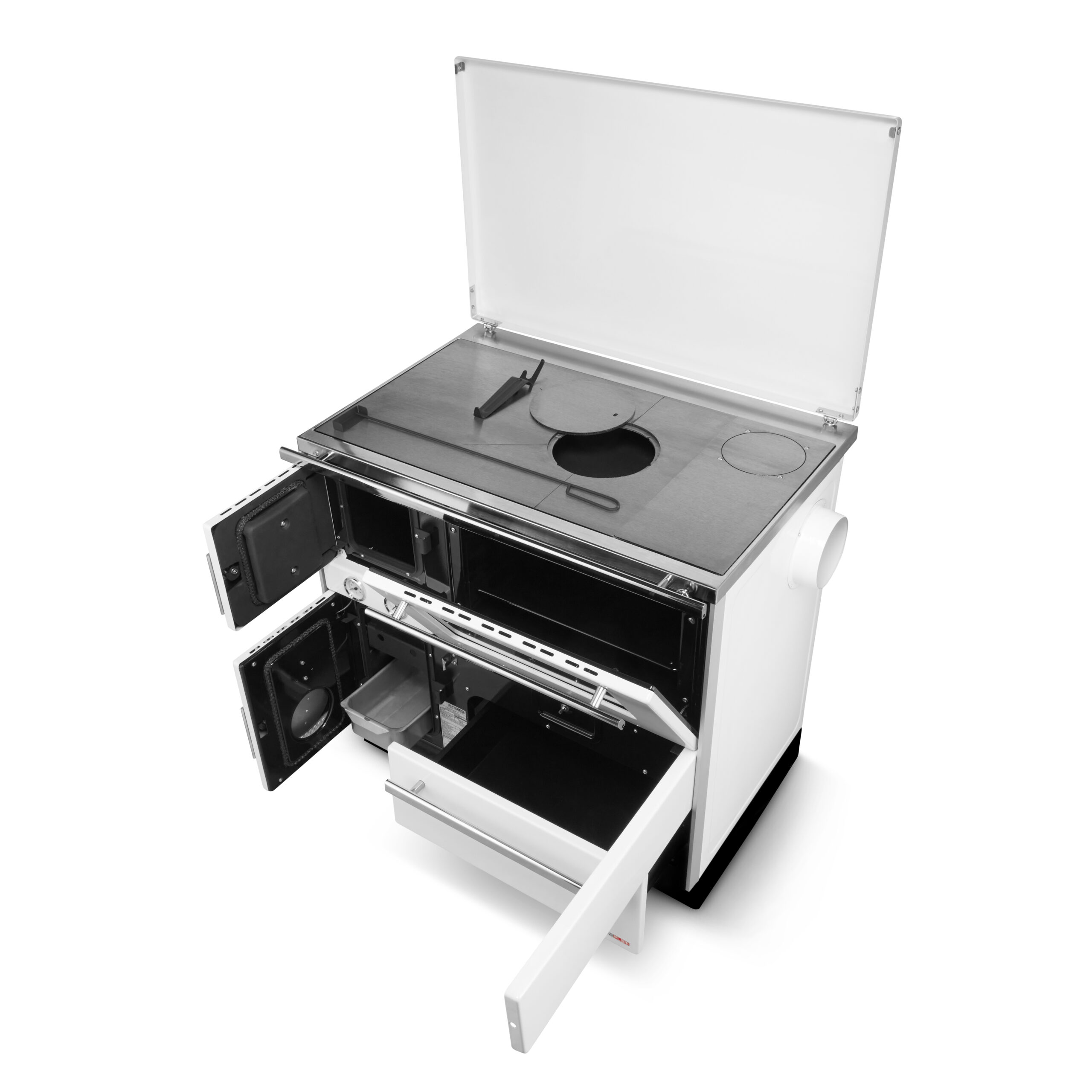 Kuchnia została zaprojektowna tak, żeby codzienne czyszczenie nie było udręką. Na dole pieca znajdziesz praktyczną szufladę na popiół – wystarczy ją wysunąć, wysypać i gotowe. W środku umieszczony jest specjalny otwór serwisowy – dzięki niemu szybko usuniesz nagromadzone zanieczyszczenia. A kiedy chcesz posprzątać dokładniej? Po prostu zdemontuj płytę grzewczą. Zrobisz to łatwo i bez narzędzi, żeby porządnie wyczyścić komorę spalania.