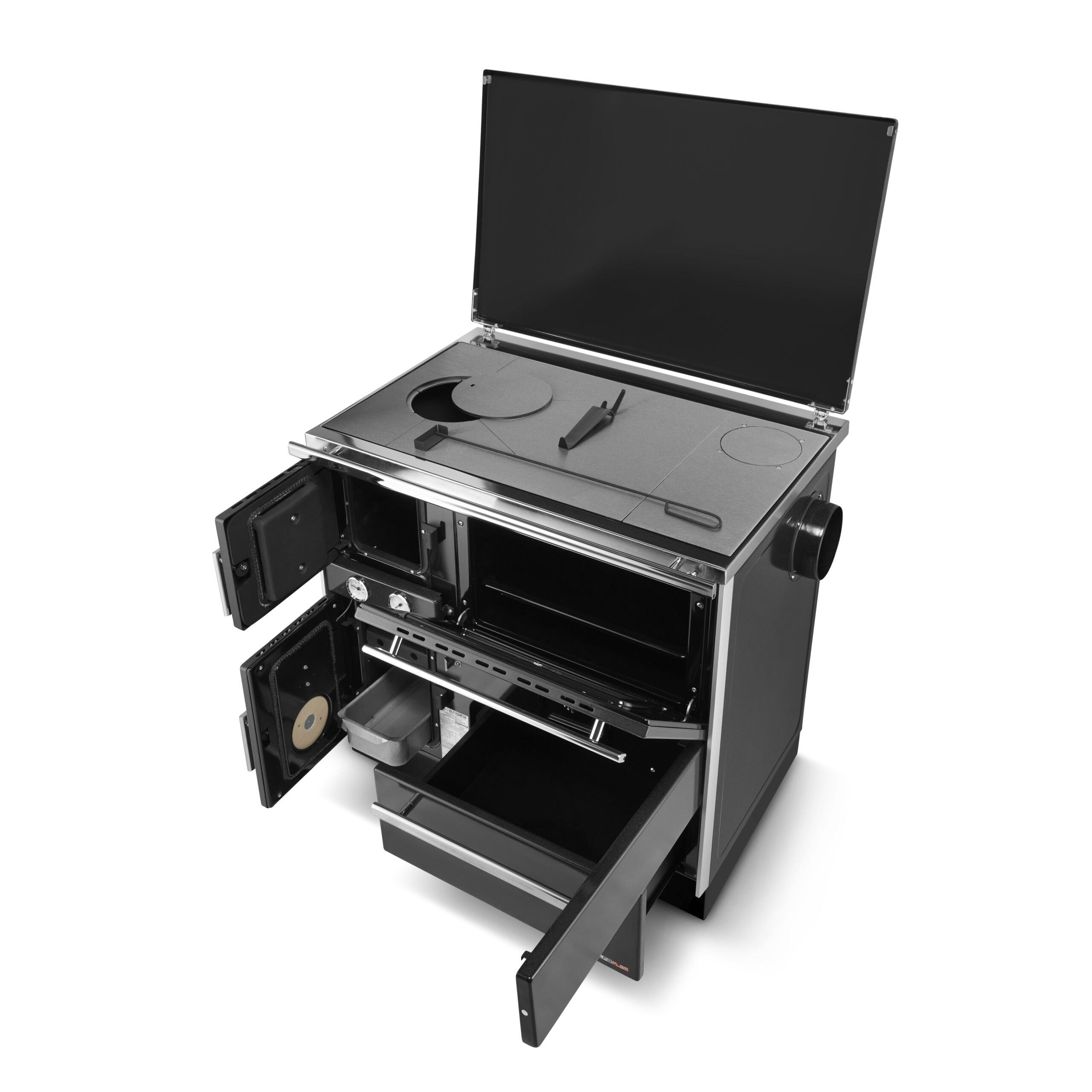 13. Specjalna szuflada na drewno oraz akcesoria do kuchni – stalowa, wysuwana szuflada bezpośrednio pod piekarnikiem pozwala na łatwe i estetyczne przechowywanie drewna, brykietu bądź innych akcesoriów do obsługi kuchni. Dzięki szczelnej konstrukcji przechowywanie drewna lub innego paliwa do kuchni nie powoduje zabrudzeń wokół kuchni i pozwala na zachowanie czystości wokół urządzenia grzewczego. Szuflada jest wyposażona w specjalne rolki umieszczone na prowadnicy, co umożliwia łatwe i płynne wysuwanie i zamykanie.