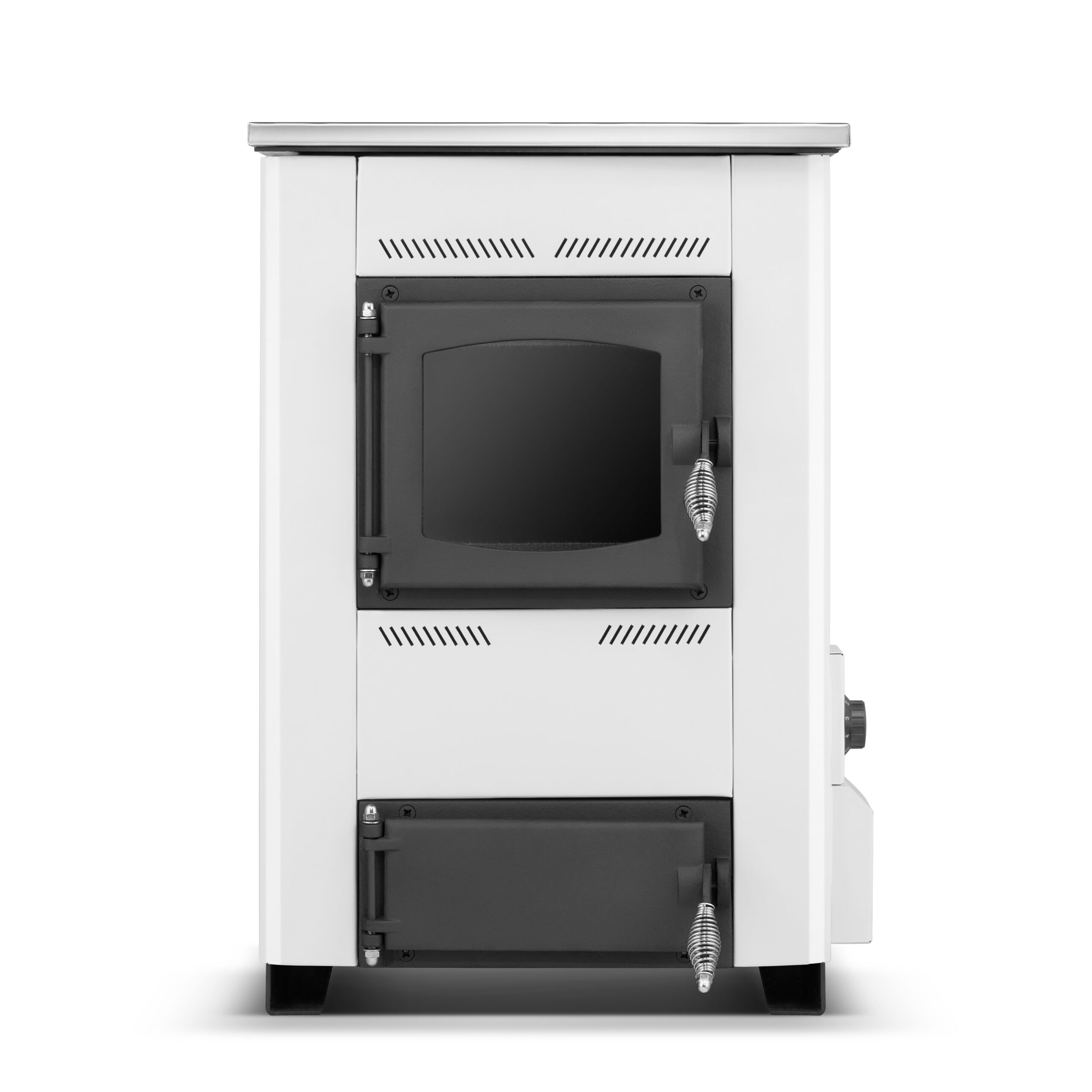 Przedni panel kuchni wyposażono w szybę żaroodporną, która oferuje efekt wizualny jak w kominku! System czystej szyby minimalizuje osadzanie się sadzy, dzięki czemu widok płomieni pozostaje wyraźny przez długi czas. To rozwiązanie łączy funkcjonalność kotła c.o. z estetyką klasycznego pieca kaflowego.