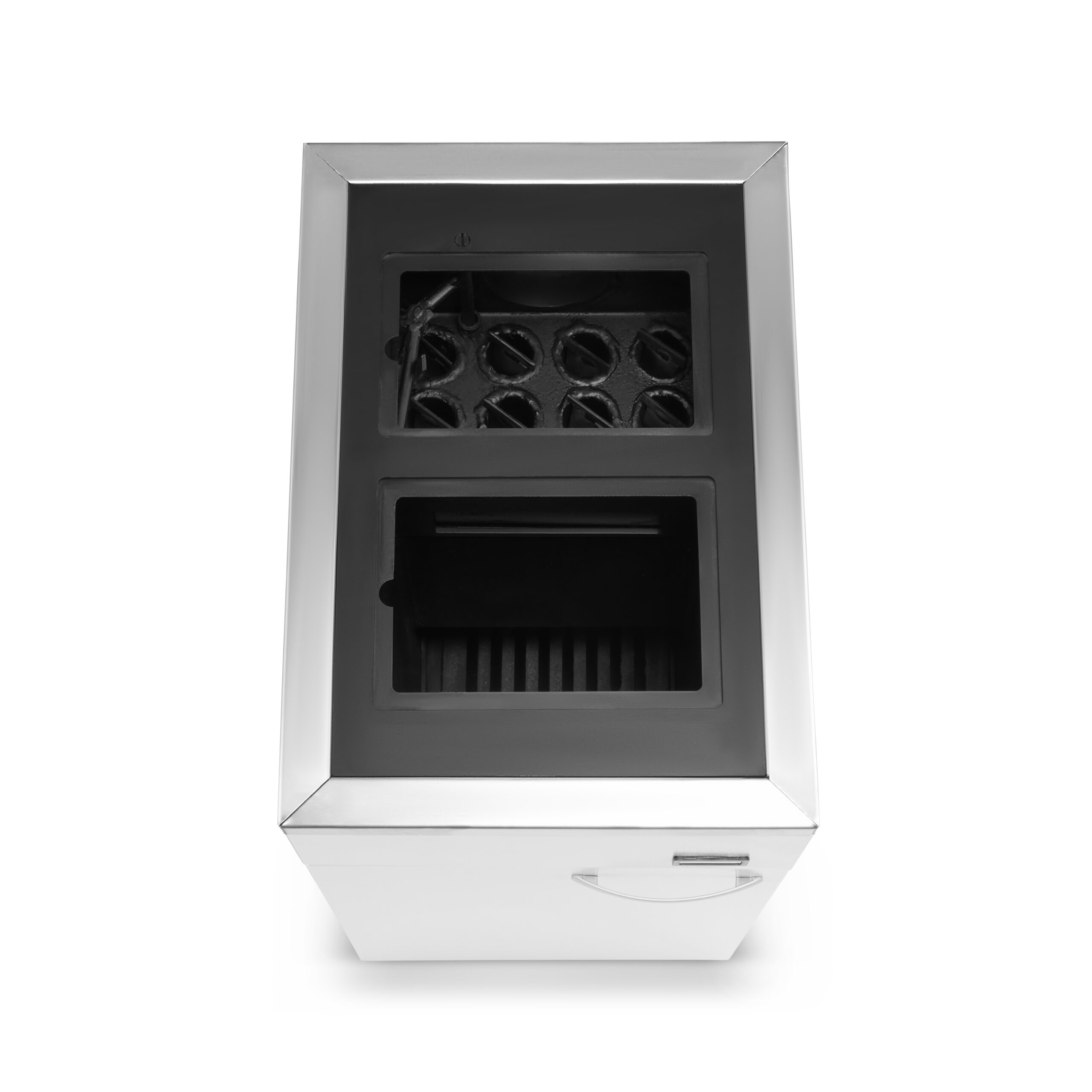 Płyta wycinana jest precyzyjnie za pomocą lasera, co zapewnia najwyższą jakość i dokładność wykonania. Wycięte w niej otwory są zabezpieczone zdejmowanymi pokrywami – tzw. „fajerkami”, które umożliwiają wygodne obsługiwanie pieca od góry bez konieczności otwierania drzwiczek komory spalania. Płyta została dodatkowo zabezpieczona estetyczną, grubą ramą ze stali nierdzewnej. Taki detal nie tylko podkreśla elegancki wygląd urządzenia, ale również ułatwia utrzymanie płyty w czystości.