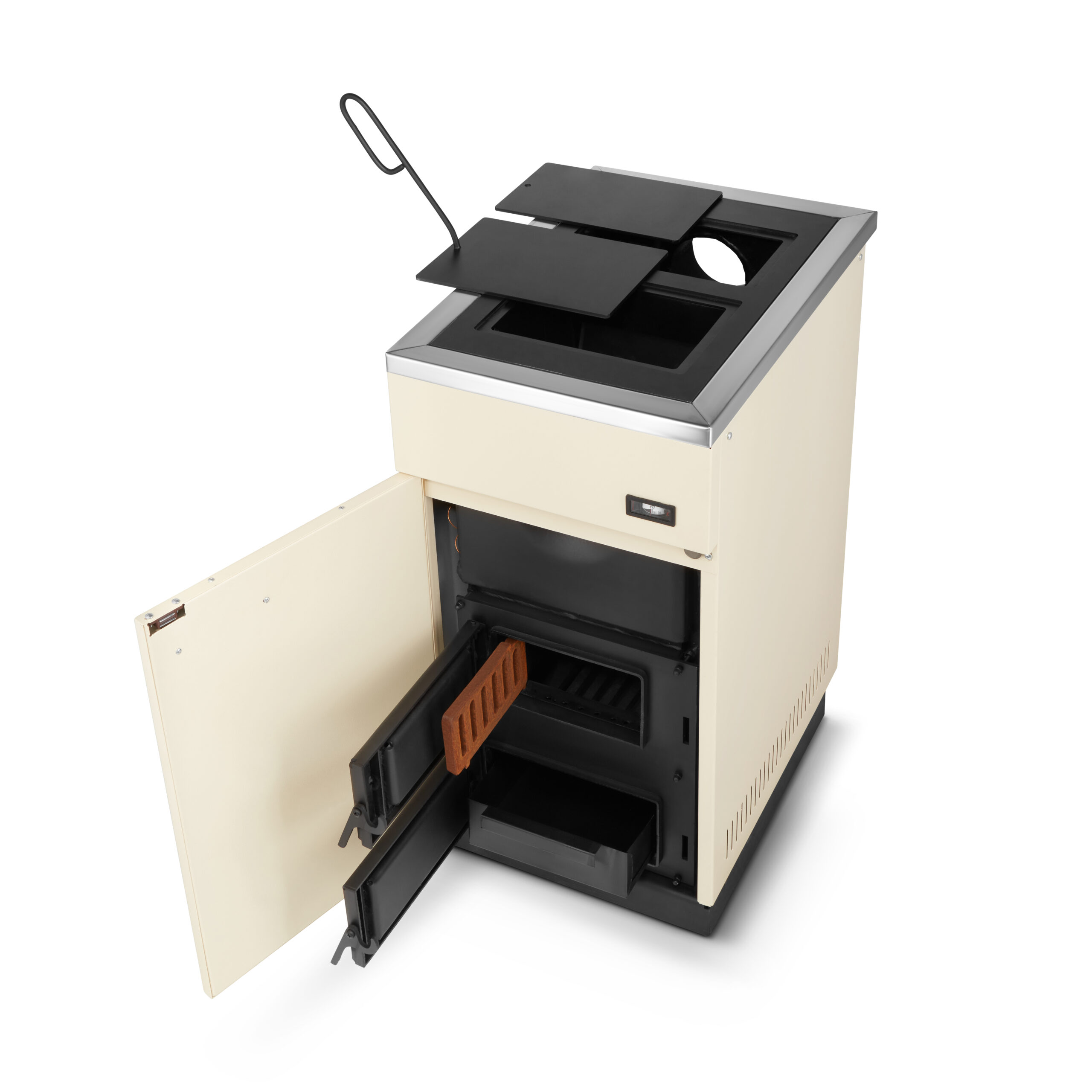 - Wielofunkcyjność – kuchnia węglowa służy zarówno do gotowania, jak i ogrzewania pomieszczenia. Ten model dodatkowo zaopatrzony jest w płaszcz wodny, więc to kolejna świetna funkcja: urządzenie 3 w 1!