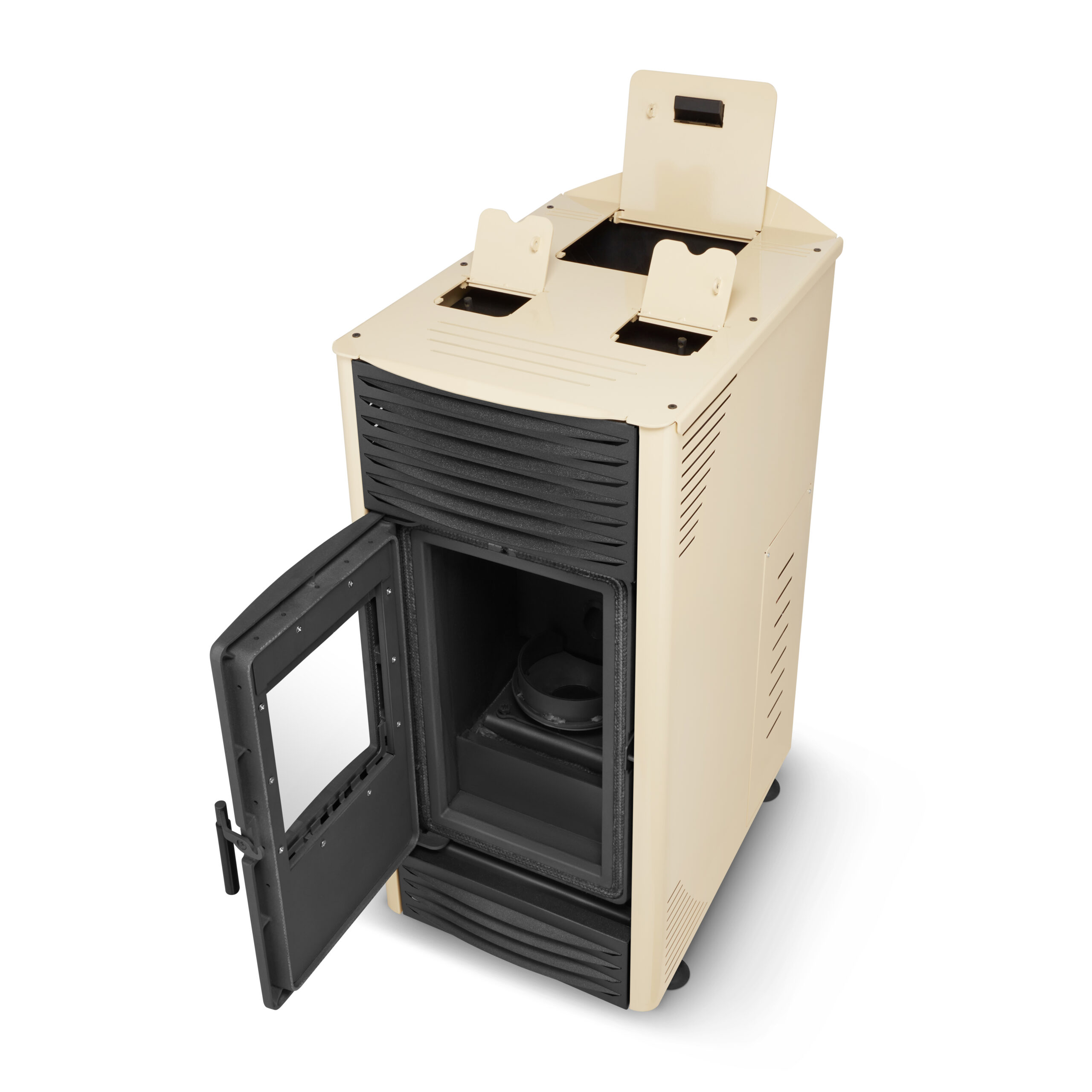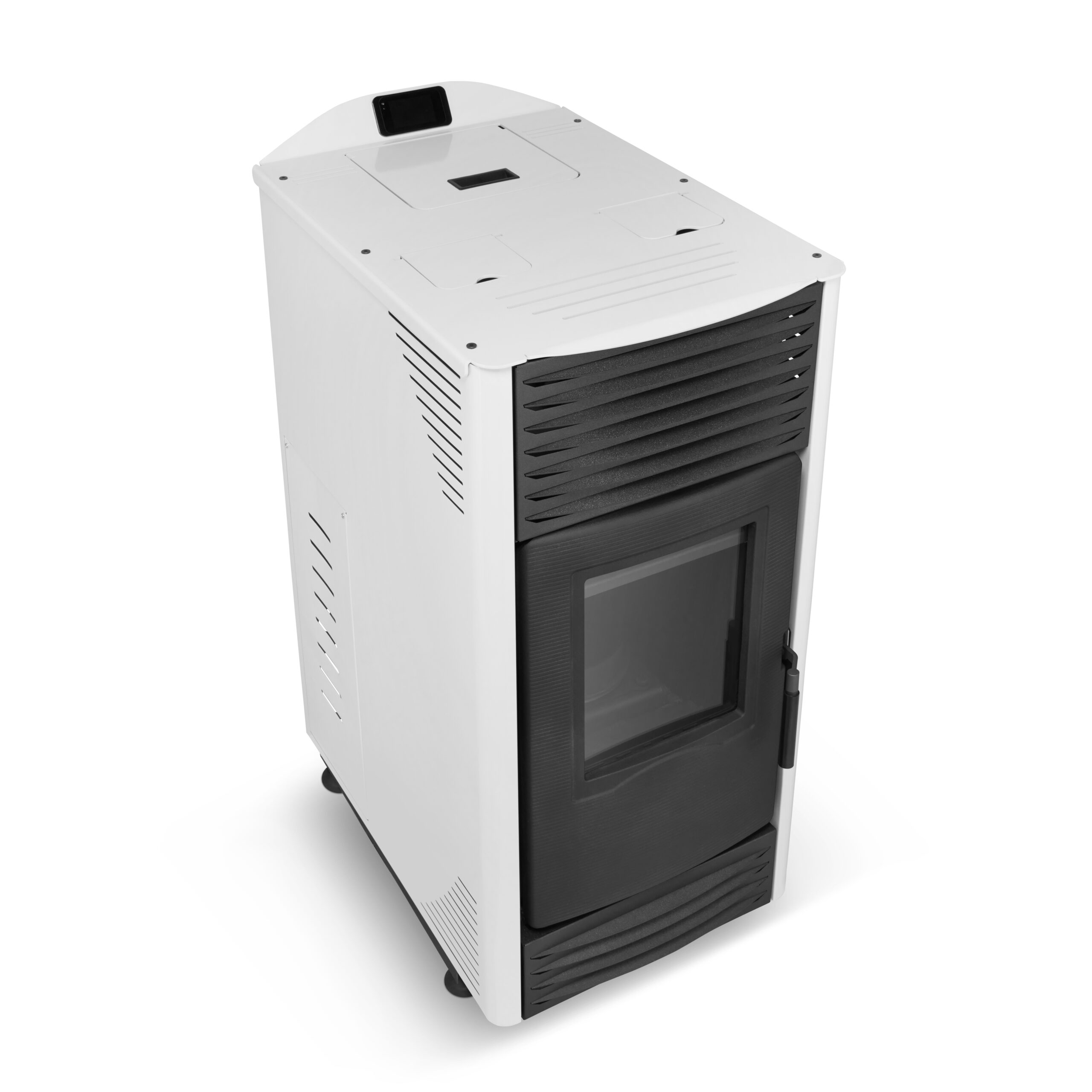 Piec wyposażony jest w zbiornik o pojemności 20 kg, co zapewnia kilka godzin nieprzerwanej pracy nawet przy maksymalnej mocy. W przypadku ustawień ekonomicznych i niższego zapotrzebowania na ciepło jedno napełnienie może wystarczyć nawet na kilkanaście godzin.