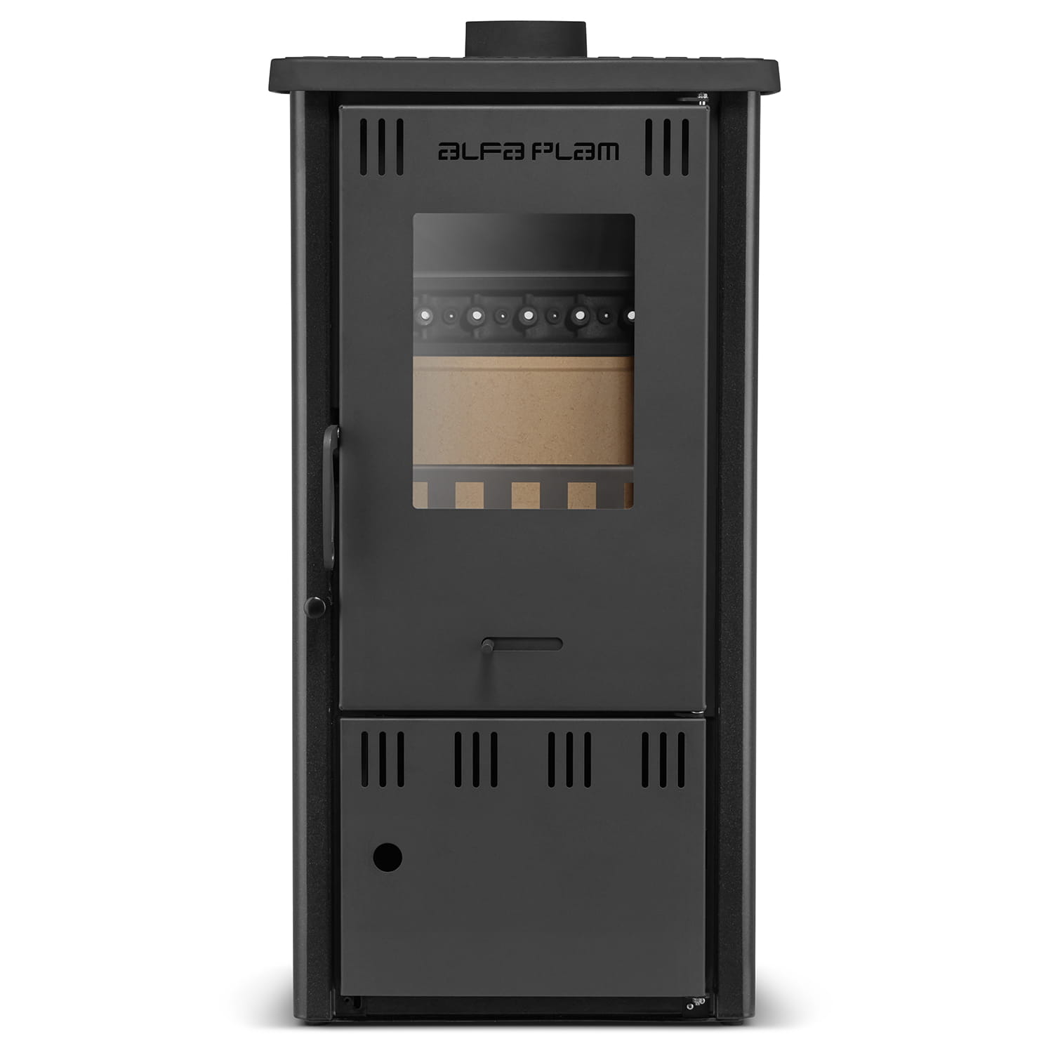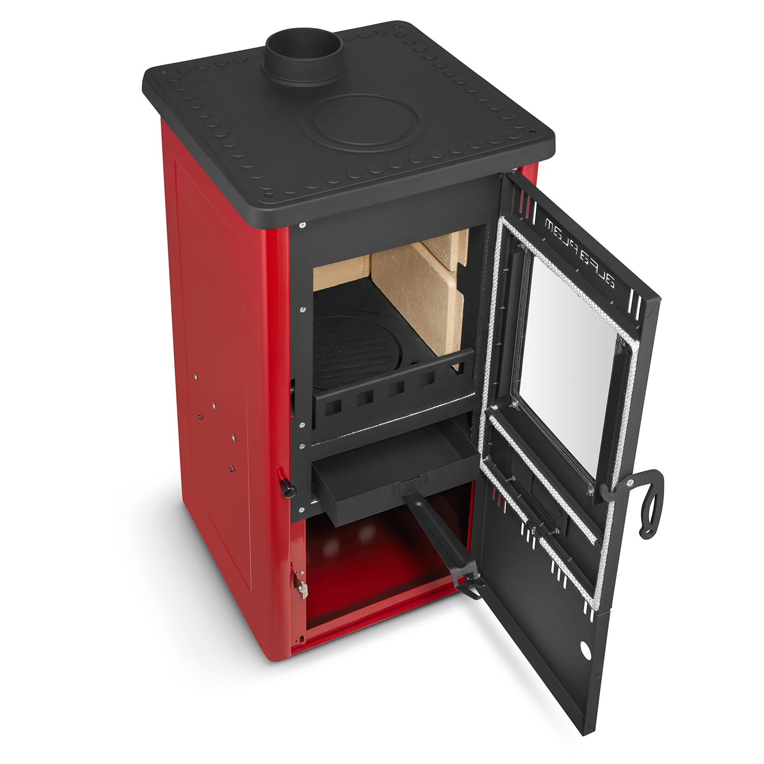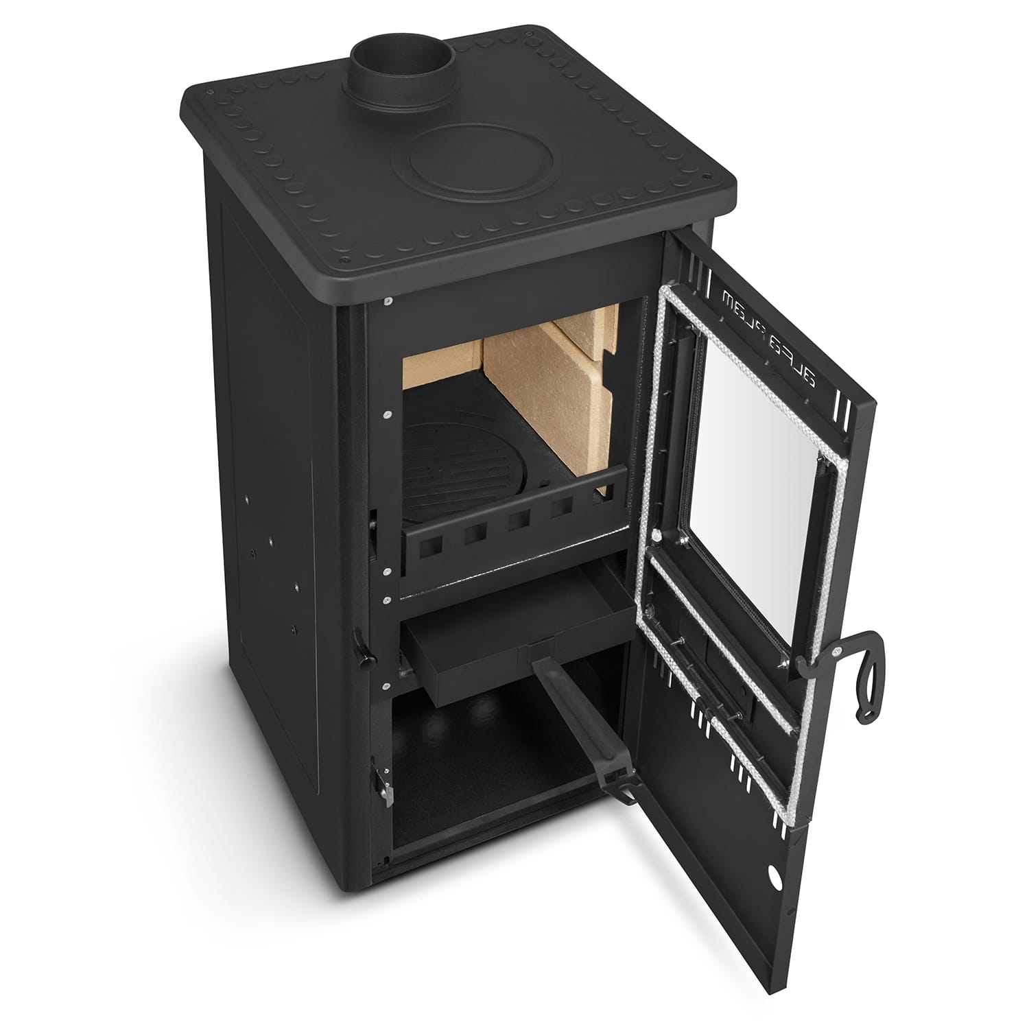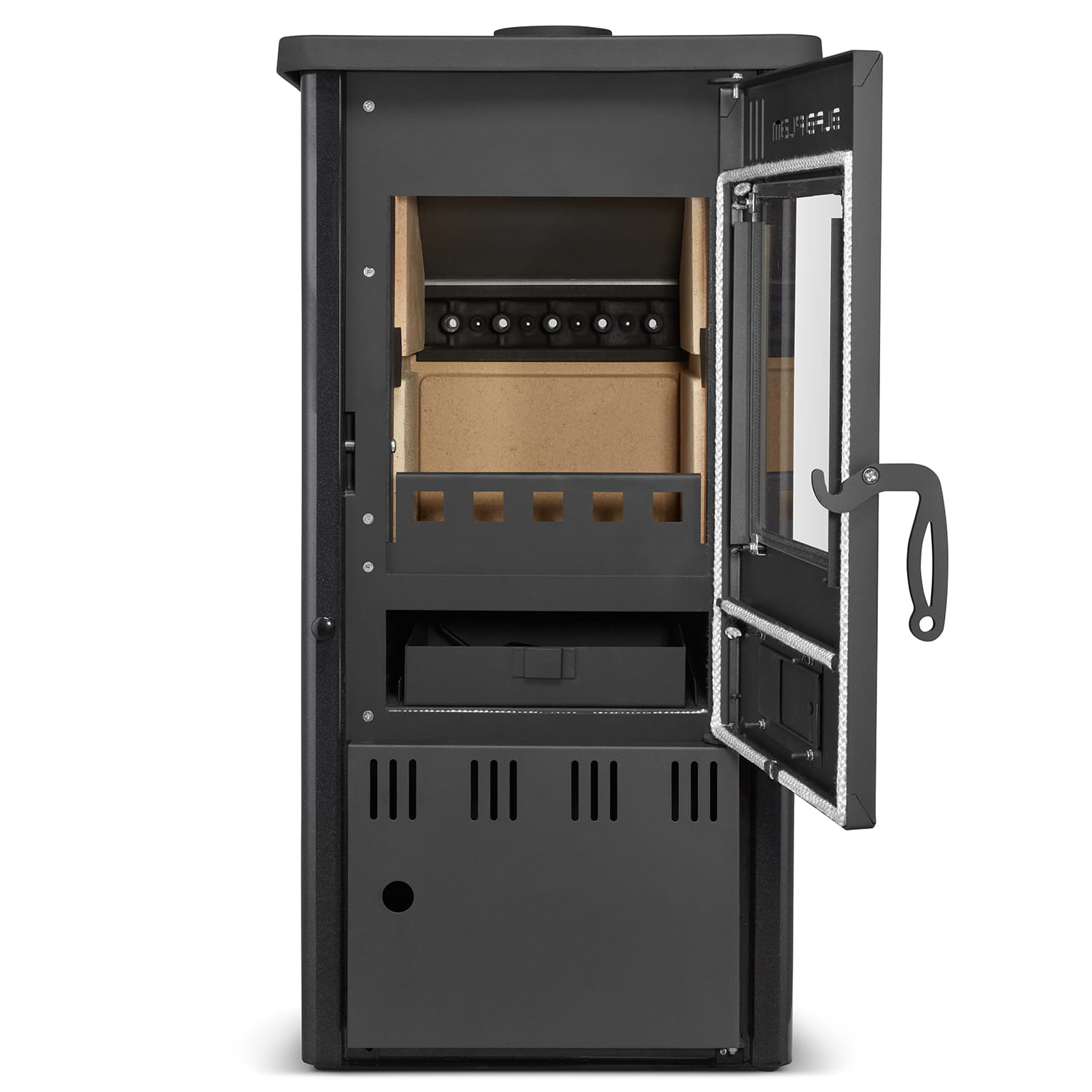 Obudowa pieca wykonana jest z wysokogatunkowej stali, która rozgrzewa się błyskawicznie, co oznacza szybkie uczucie ciepła w pomieszczeniu. Wnętrze komory spalania wyłożono szamotem – materiałem, który pozwala na magazynowanie energii cieplnej i daje efekt dłuższego oddawania ciepła nawet po wygaszeniu ognia. W praktyce zyskujesz: krótszy czas nagrzewania, dłuższe oddawanie ciepła, mniej pracy przy dokładaniu drewna i bardziej stabilną temperaturę w pomieszczeniu.
