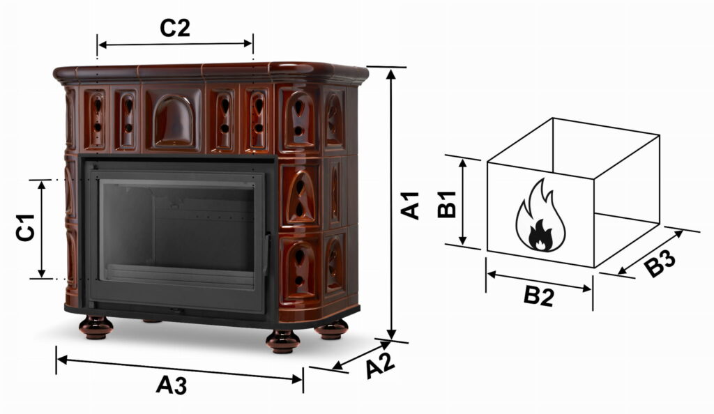 wymiary paleniskawysokość – 35 cm x szerokość – 50 cm x głębokość – 28 cmwysokość – 33 cm x szerokość – 55 cm x głębokość – 33 cm