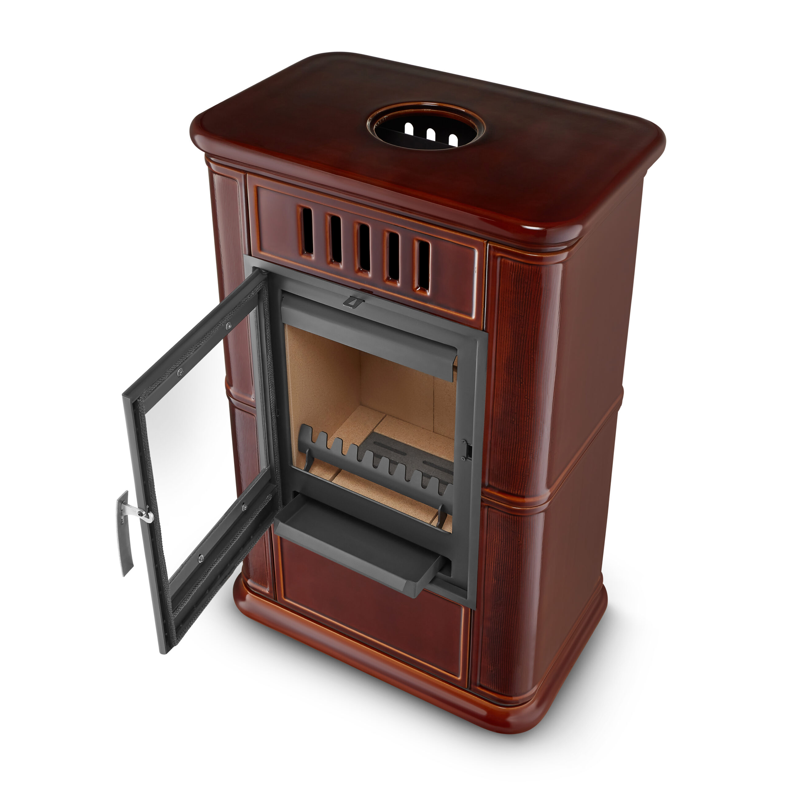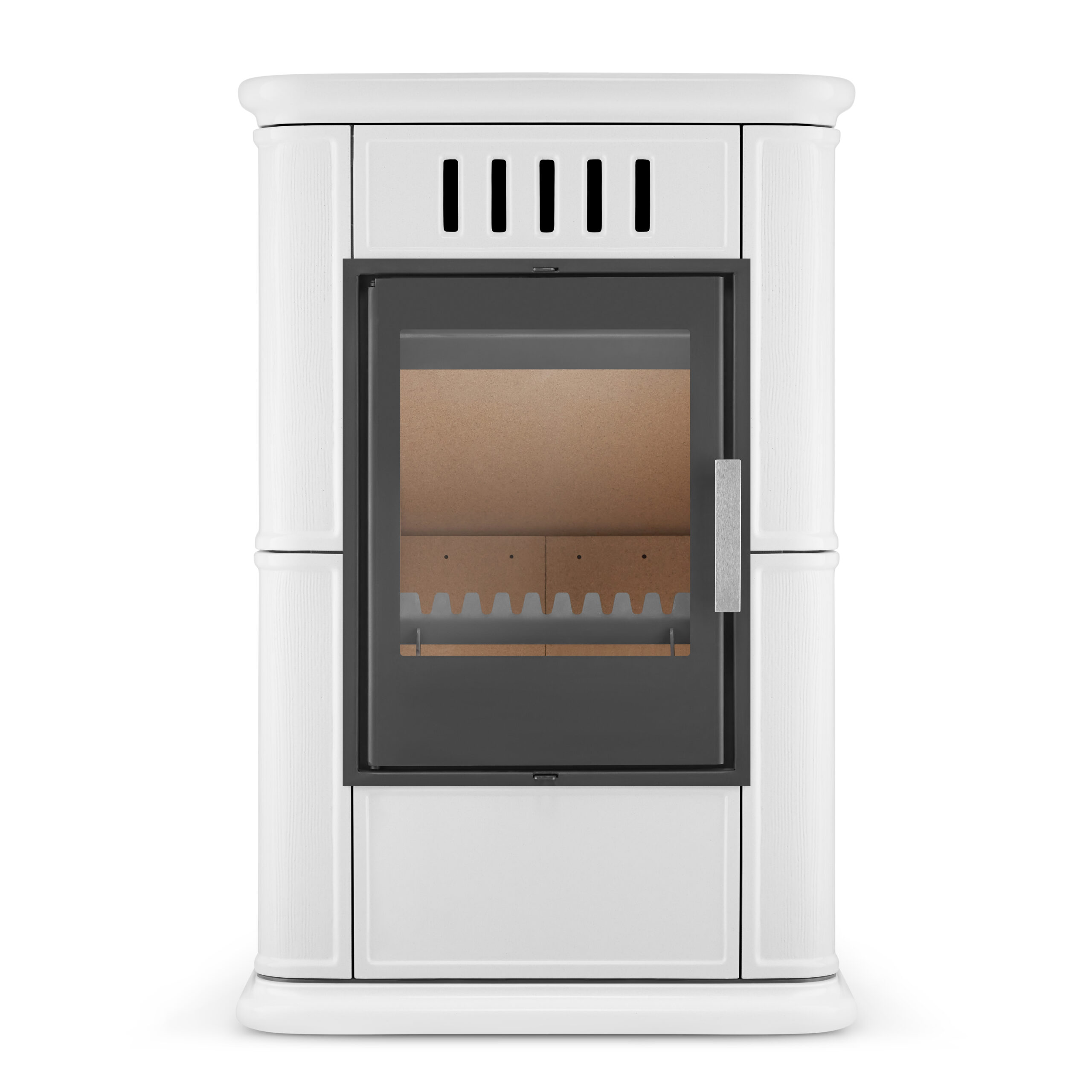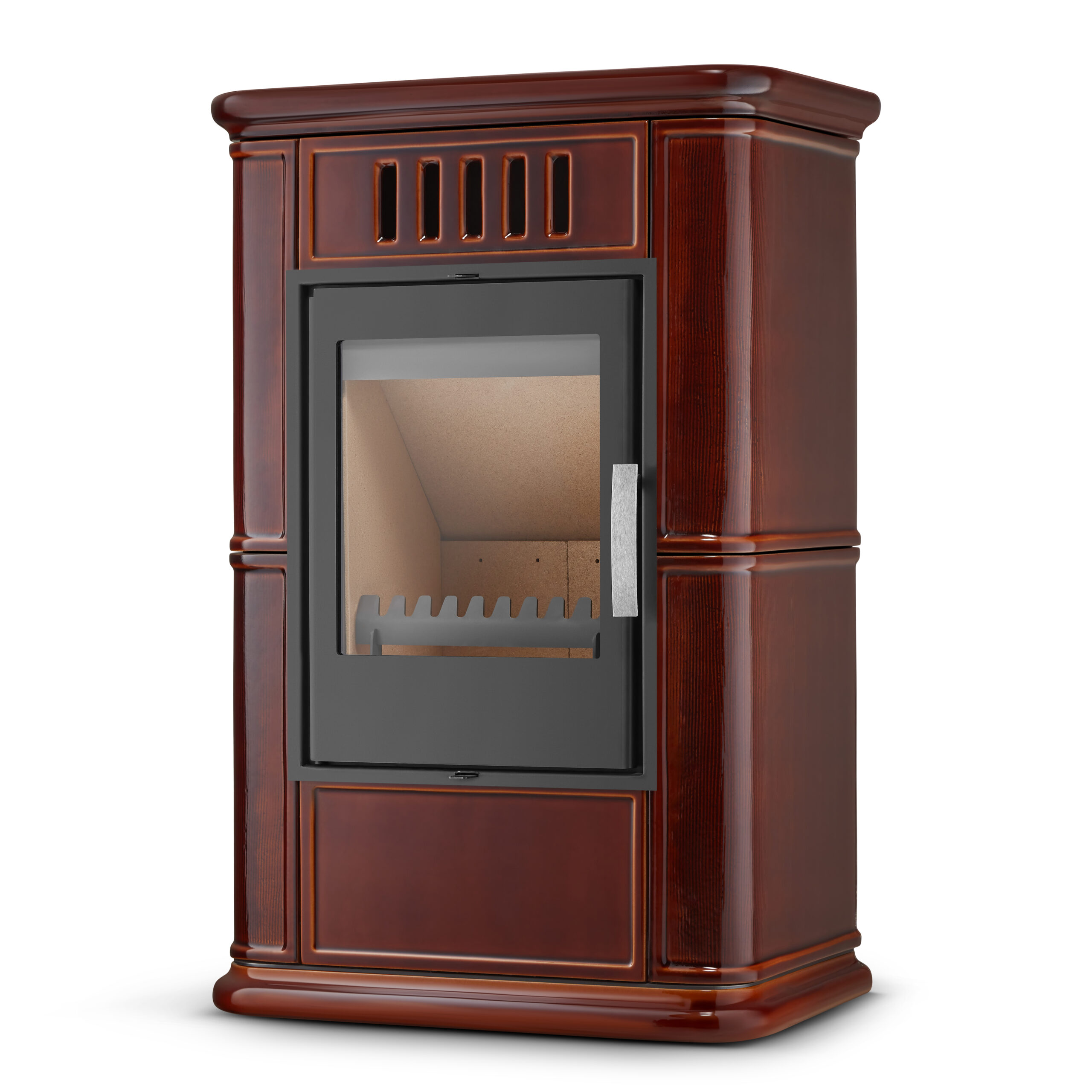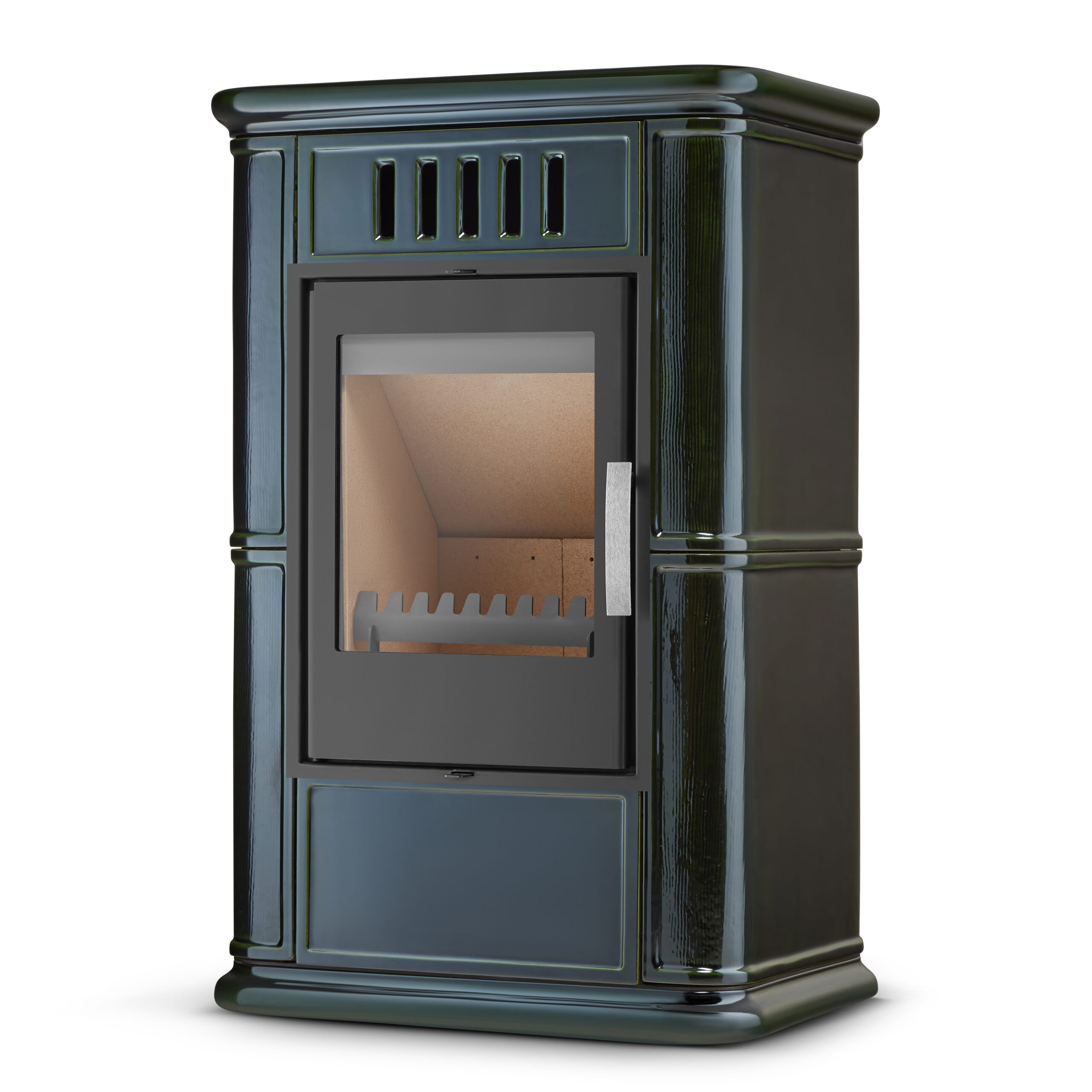 • Szkliwiona powierzchnia – pięknie odbija światło płomieni i nadaje kominkowi subtelnego blasku. Szkliwo nie tylko podnosi walory estetyczne, ale również ułatwia czyszczenie, zapobiegając wchłanianiu kurzu czy osadzaniu się sadzy.