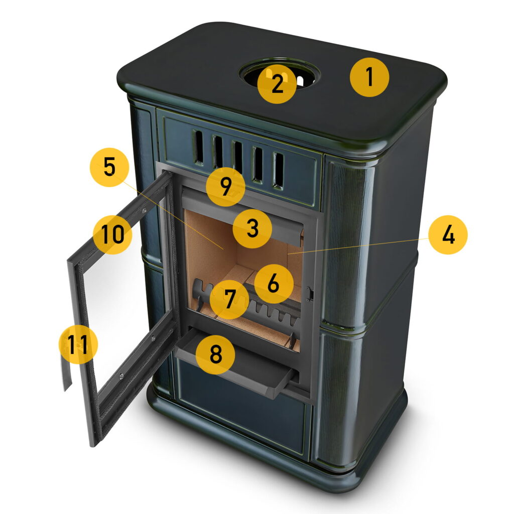 Kominek OLBIA został wykonany z najwyższą starannością i dbałością o każdy szczegół. Poniżej przedstawiamy schemat przedstawiający najważniejsze elementy budowy kominka.