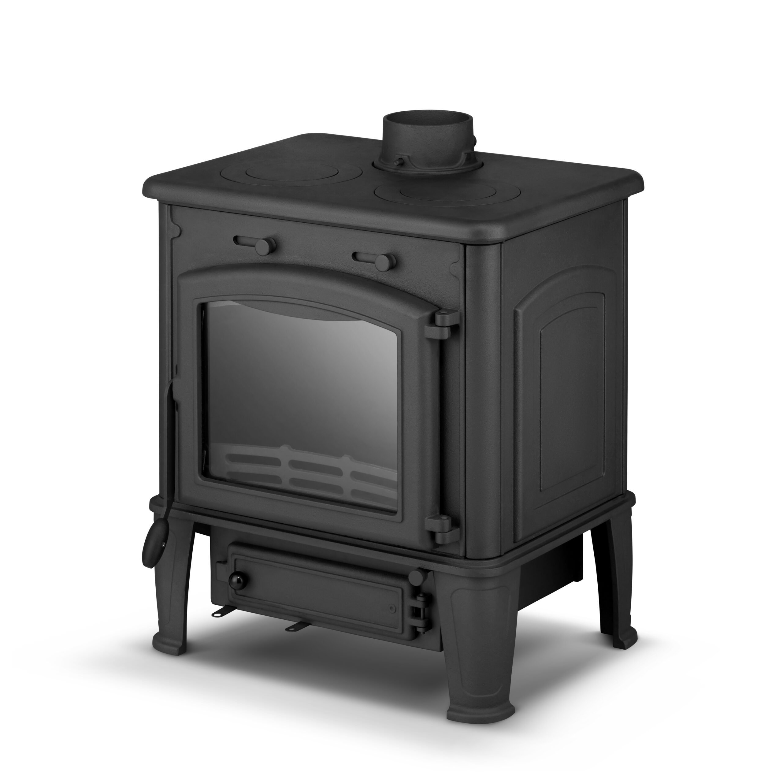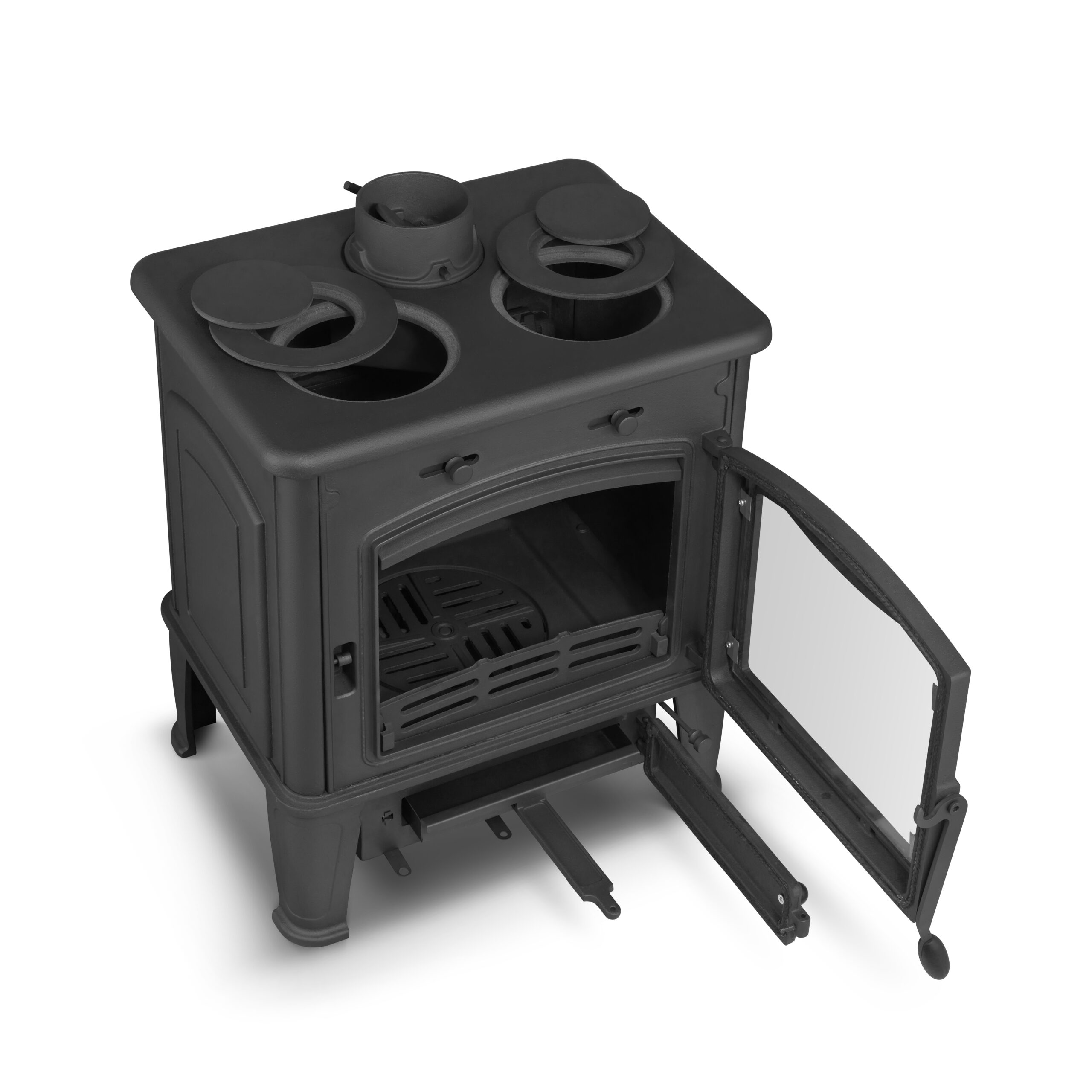 - Gruba żeliwna płyta nagrzewa się równomiernie i długo utrzymuje ciepło, co oszczędza opał i zwiększa efektywność cieplną.