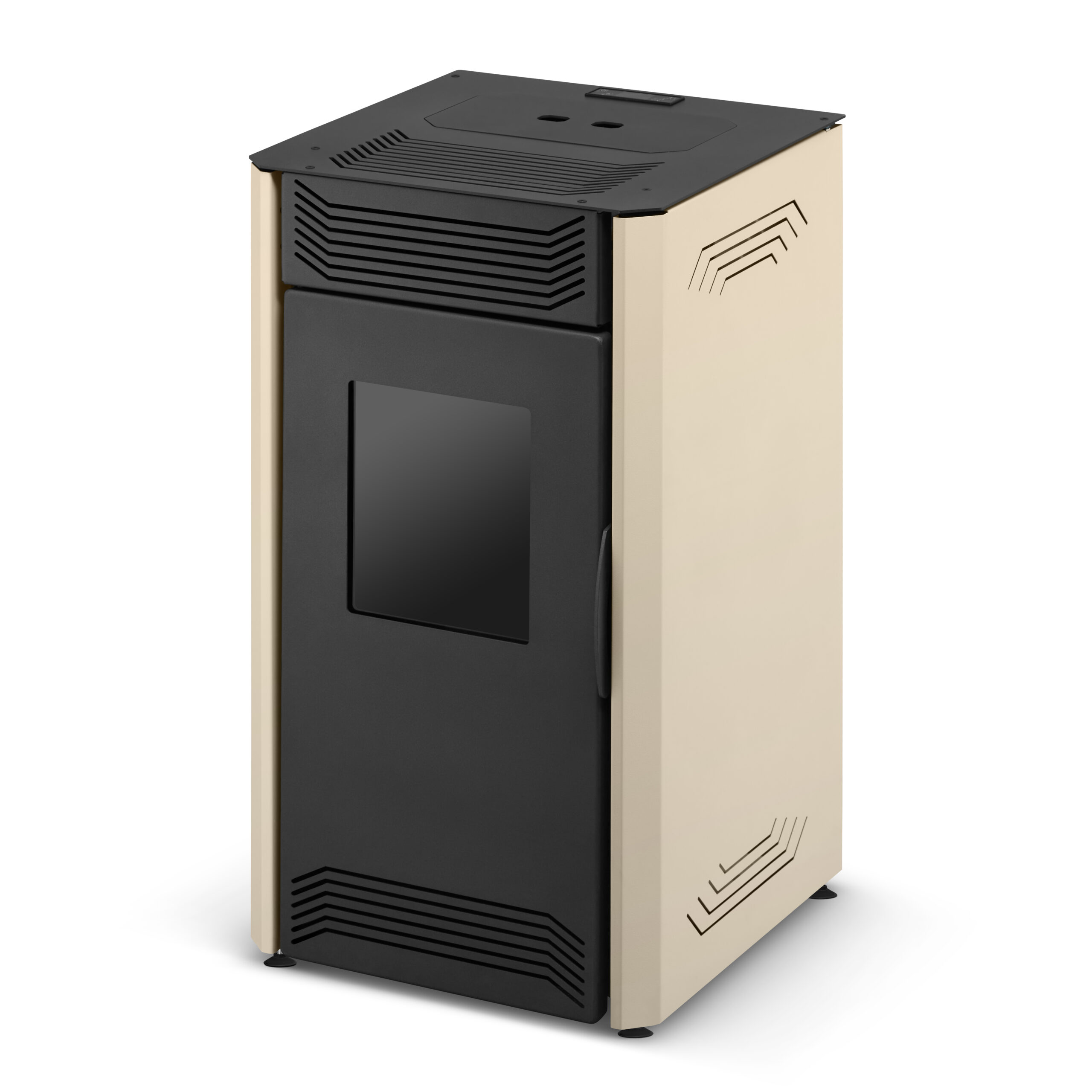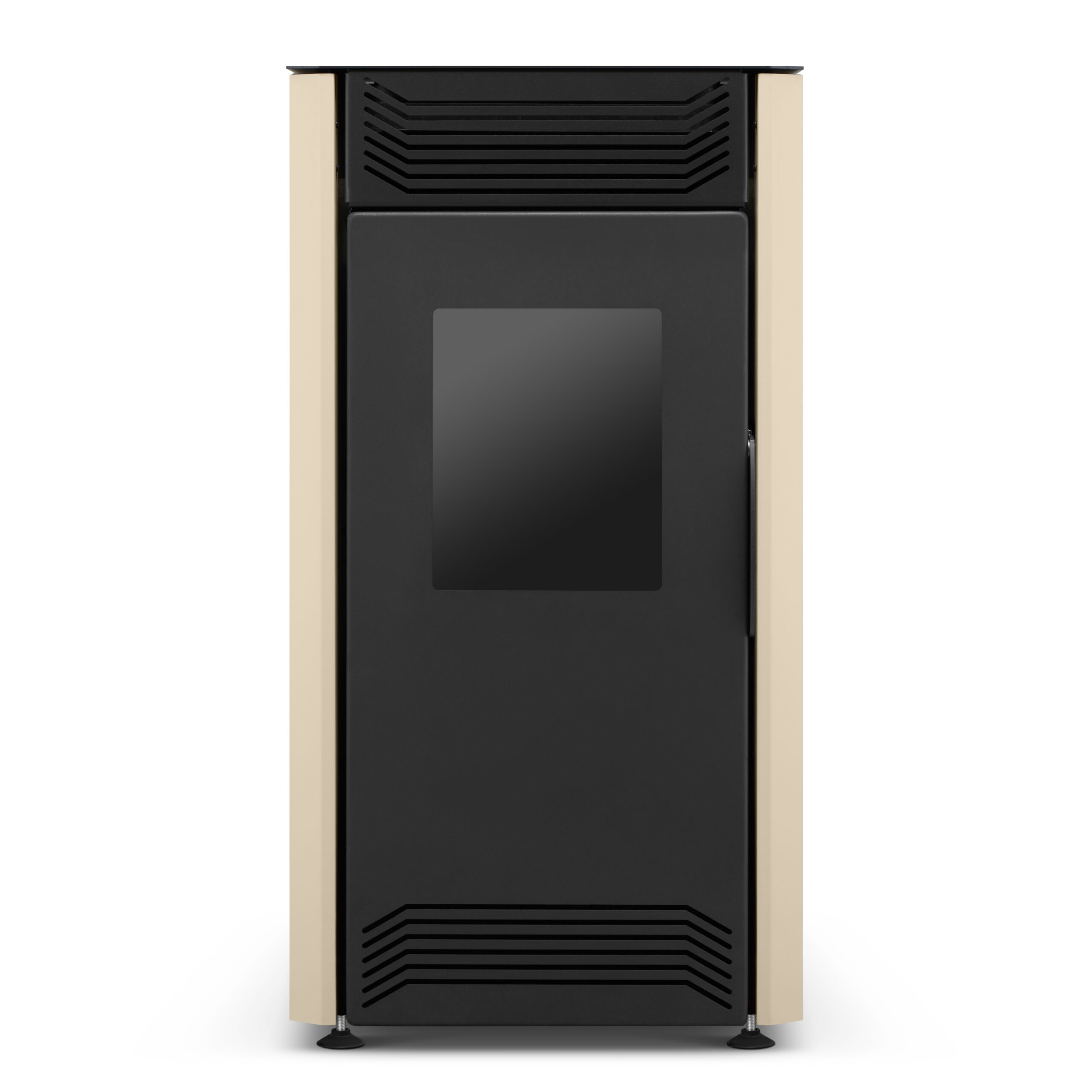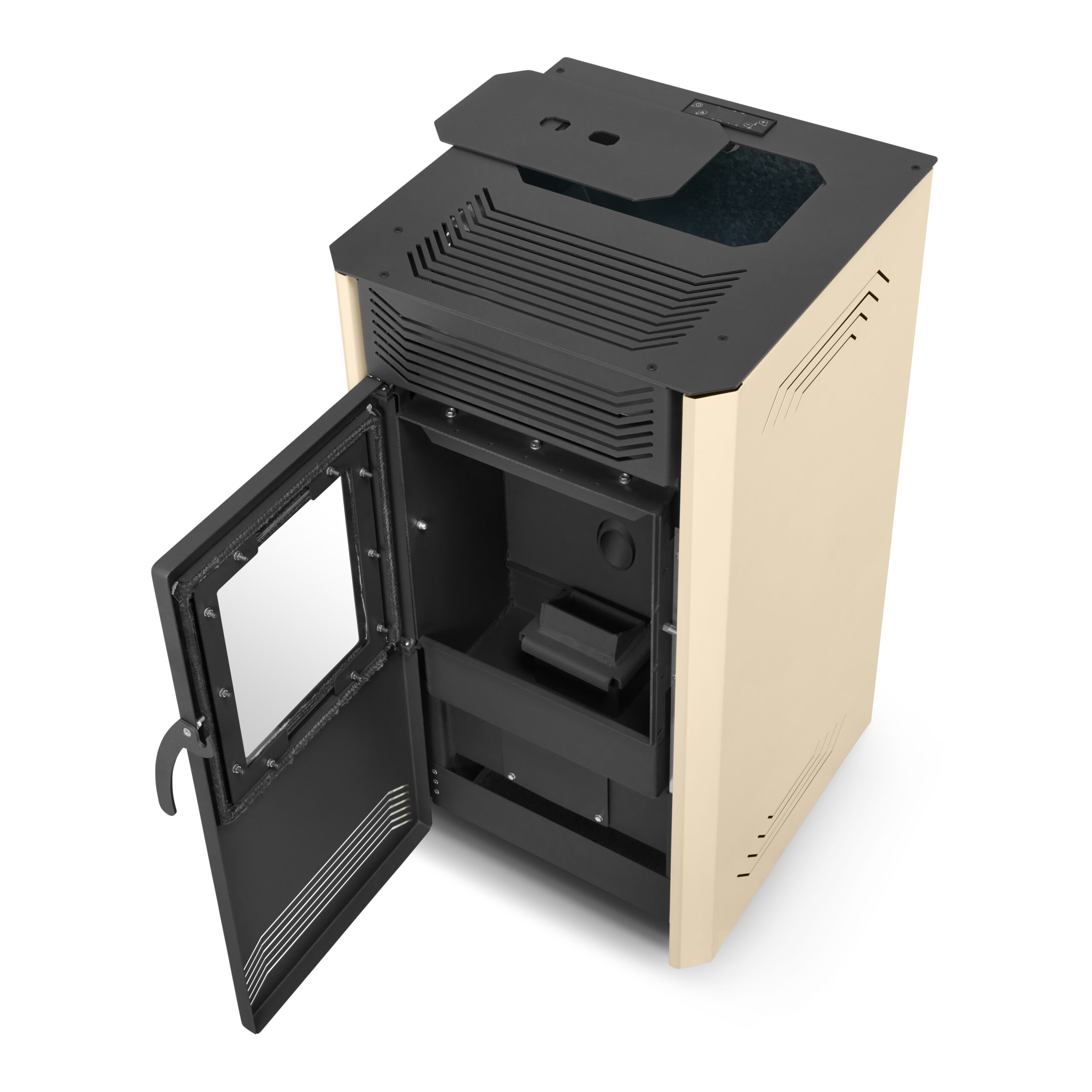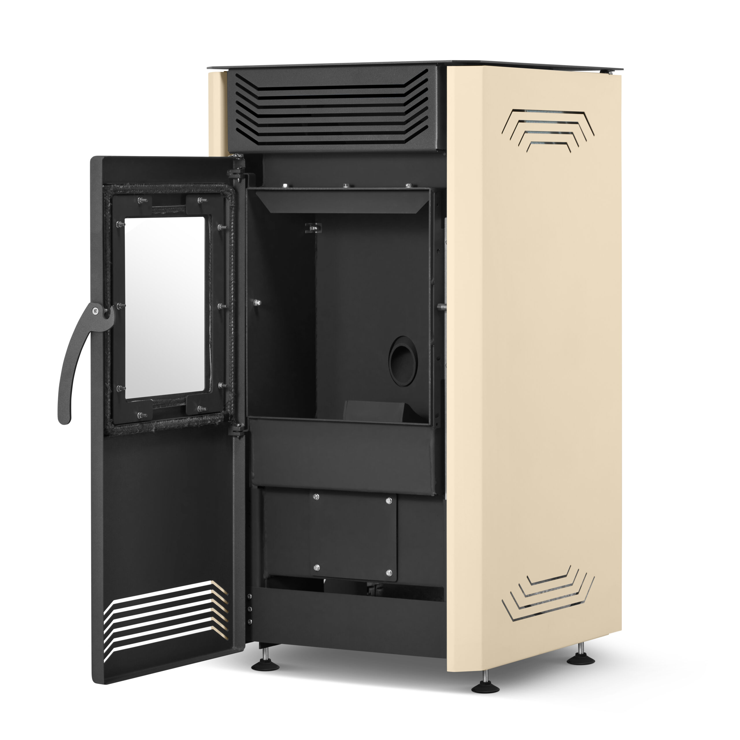 Piec OPTIMA 8 łączy w sobie minimalistyczną elegancję z solidnością wykonania. Jego stalowa obudowa została pokryta żaroodporną farbą, co zapewnia trwałość oraz odporność na wysokie temperatury. Połączenie czarnego frontu i beżowych boków sprawia, że model ten stanowi nie tylko urządzenie grzewcze, ale także estetyczny element wystroju.