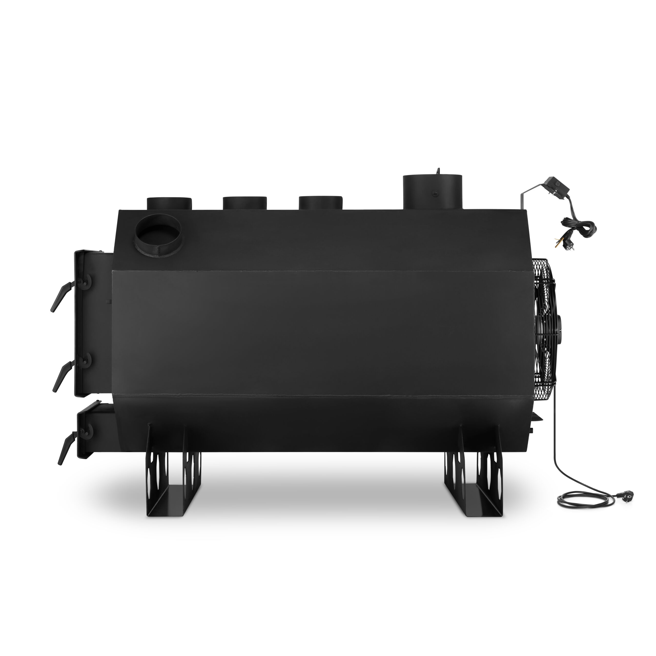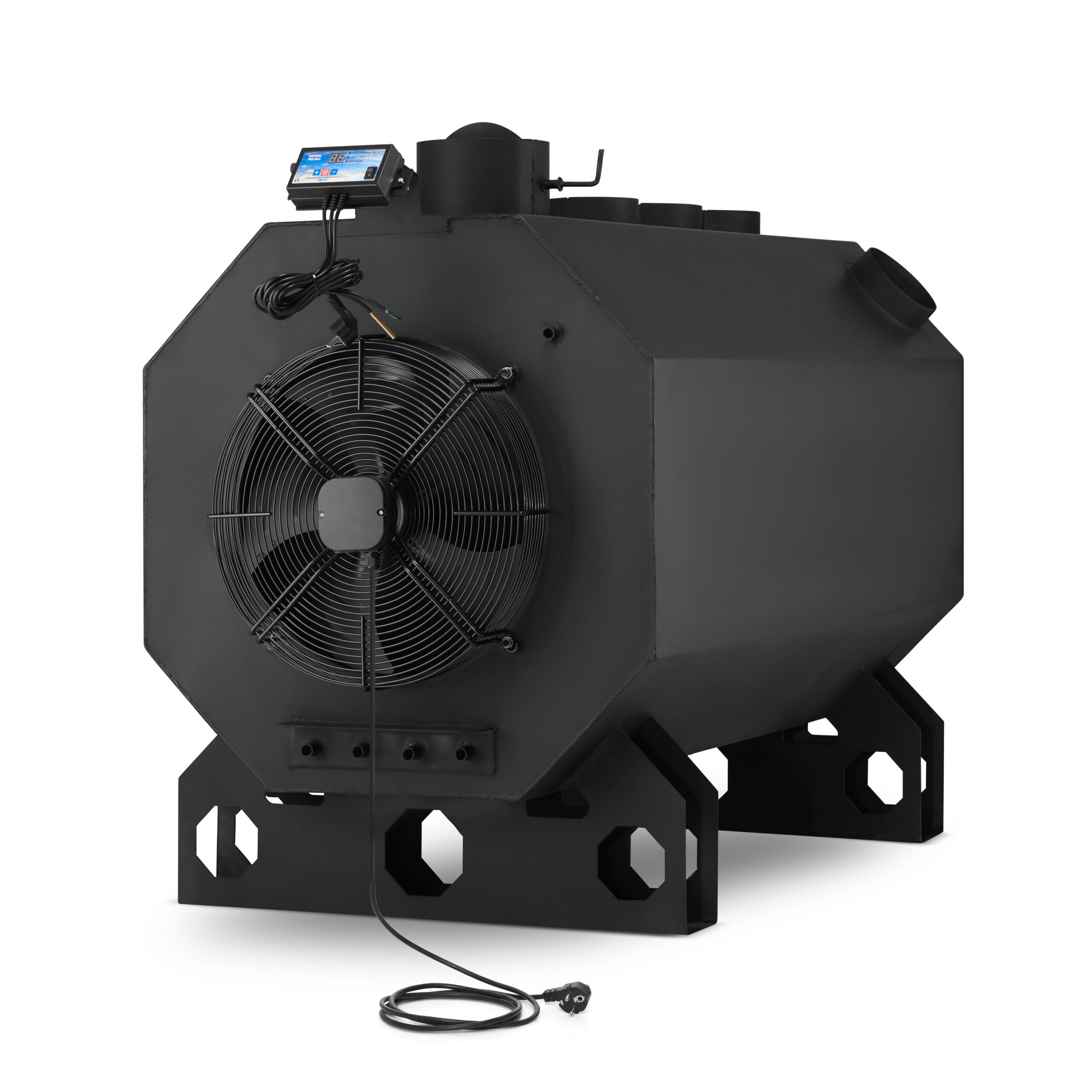 W piecu zastosowano osiowy wentylator tłoczący o średnicy 450 mm, który zapewnia wydajność aż 5550 m³/h. Dzięki temu ciepłe powietrze jest efektywnie rozprowadzane po całym pomieszczeniu. Silnik o mocy 0,82 A, obroty 1380 obr./min oraz solidna stalowa konstrukcja gwarantują niezawodność i długą żywotność.